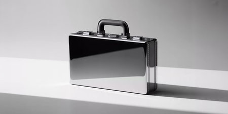 A shiny silver briefcase with a black leather handle rests on a white surface, reflecting light and shadows.