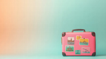 A vibrant pink suitcase covered in travel stickers rests against a pastel backdrop, evoking a sense of nostalgia for adventure and exploration.