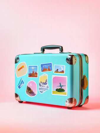 A vintage blue suitcase features various travel stickers, showcasing destinations and adventures against a soft pink background.