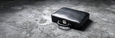 Black leather briefcase positioned on a rough concrete floor in low light, highlighting its elegant features and professional allure in an industrial setting.