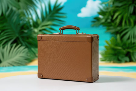 Modern brown suitcase in the sand, in front of a beach generative ai