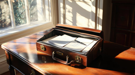 A beautifully crafted brown leather briefcase open on a polished wooden table, showcasing notepads and a pen. Soft natural light cascades through the window, highlighting the elegance and simplicity of the workspace. Perfect for themes of creativity and professionalism.