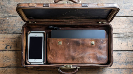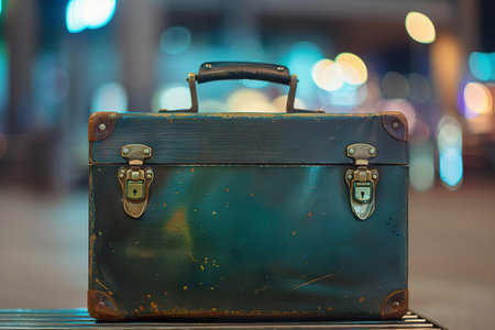 This vintage leather suitcase showcases a distressed texture and a wooden handle, ideal for evoking travel nostalgia in various creative projects or communications.
