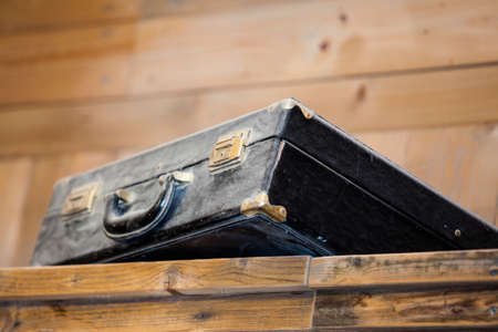 Old vintage suitcase in the room. The suitcase handle. Foreground, horizontal photo