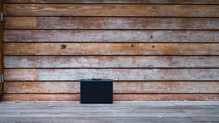 Vintage suitcase on wooden floor in dark room, retro toned.generative ai