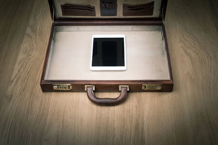 Leather suitcase with notebook and purse on a white background. Business concept. Top view