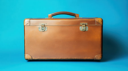 A vintage leather suitcase displayed against a vibrant blue background, perfect for travel themes, nostalgia, or showcasing timeless travel accessories in creative projects.