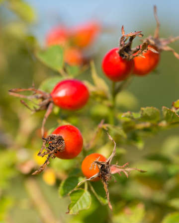 Red ripe berries of wild rose. Vitamin product. Wildlife. Autumn season. Blue sky and white clouds in the background.