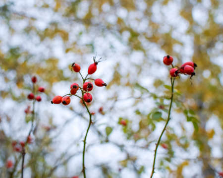 Red rose hips on a blurred background with yellow and greeen leaves. Close up, toned
