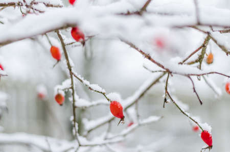 Bright cankerberry berries on a background of snow in February. wild rosehips .