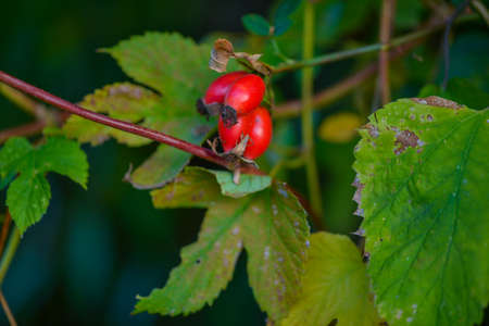 Beautiful Branch with rose hips, medicinal red forest berry. Healing berry.