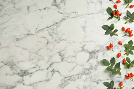 Ripe rose hip berries with green leaves on white marble table, flat lay. Space for text