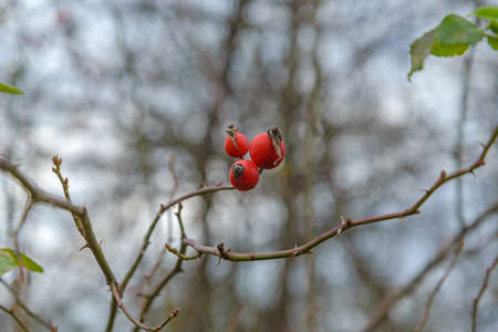 Red rosehips in a hedge in nature in early winter with defocused branches and sky in the background
