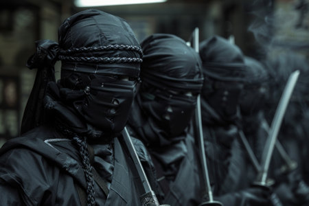 A group of soldiers or warriors in dark suits and masks with weapons.