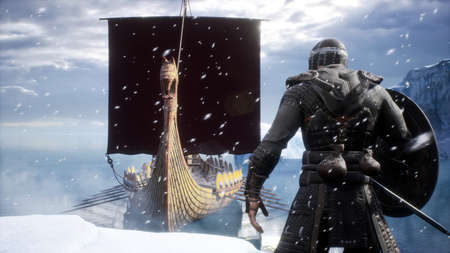 A fearless viking stands on a glacier next to his Drakkar during a snowstorm. Viking warship in winter natural conditions. 3D Rendering