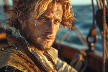 Strong warrior stands confidently on ship deck with flowing hair and detailed armor illuminated by sunset. Ocean setting enhances historic atmosphere.