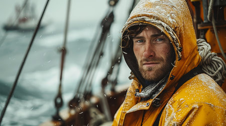 Portrait of a fisherman on an industrial fishing ship in harsh weather.