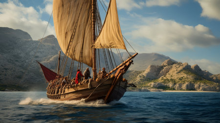 Ancient Greek ship sailing on vast sea crew in colorful togas