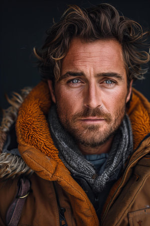 Rugged man with beard and piercing blue eyes