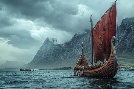 Group of vikings are floating on the sea on Drakkar with mountains on the background.