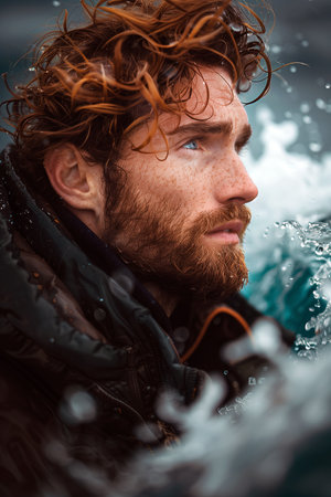 A portrait of a seafarer surrounded by splashes of water at storm during marine travel.