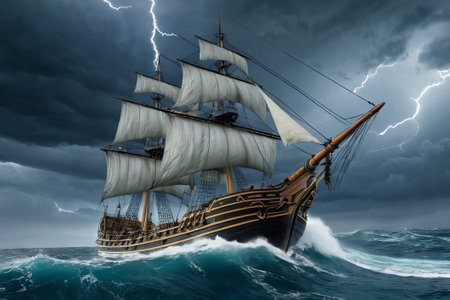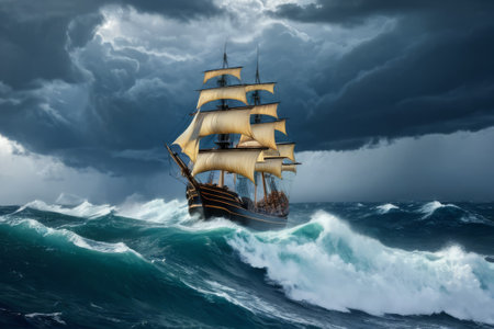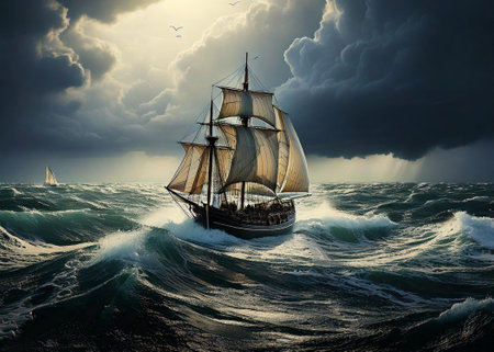 Experience the thrill of adventure in a dramatic photo capturing a majestic sailboat navigating stormy seas a testament to courage and resilience amidst nature fury.