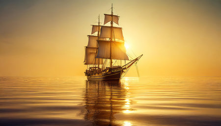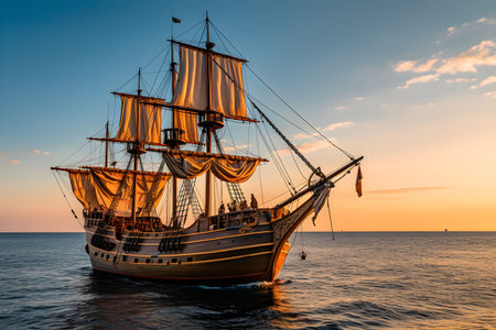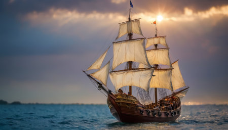 A magnificent historical tall ship with full sails cruises on the open ocean at sunset. The golden light of the setting sun beautifully illuminates the sails and the ship's silhouette, evoking a sense of adventure, exploration, and maritime history.