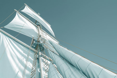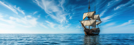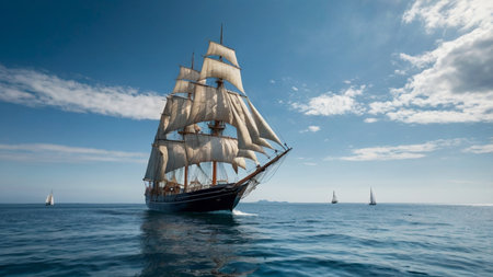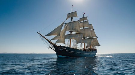 A majestic tall ship with full sails cuts through the waves of the open sea. This vintage style image captures the spirit of adventure and maritime history.