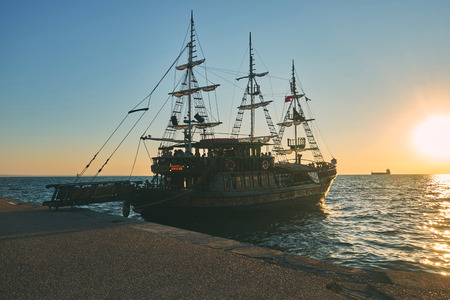Beautiful old sailboat in sunset rays on the sea, old sailing brigantine.