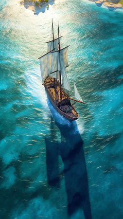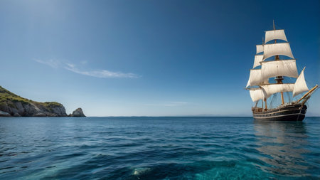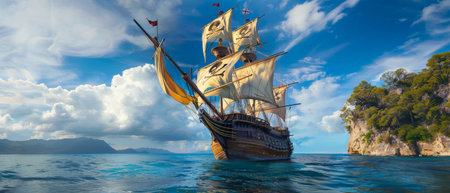 pirate ship on the high seas, with sails unfurled and crew at the ready, created with generative ai