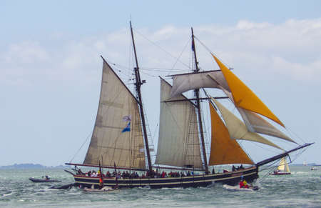 The historic Etoile de France sailboat sails on the ocean surrounded by small boats.