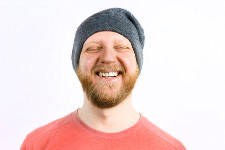 Portrait of a happy young man with beard smiling against gray background