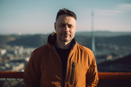 Portrait of a handsome young man in an orange jacket on the roof