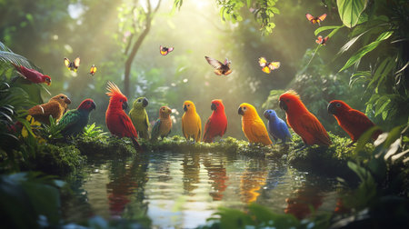 Colorful parrots on the pond in the tropical garden with sunlight