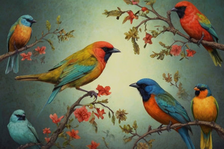 Colorful birds on a branch of a flowering tree. Vintage painting.