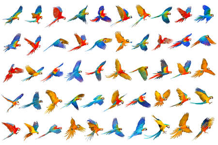 Colorful set of macaw parrot isolated on white background.