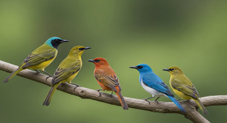 Collection of colorful birds sitting on a tree branch with blue sky background