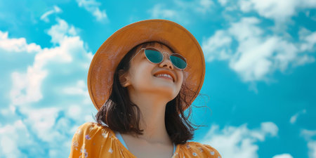 A young woman stands outdoors, gazing thoughtfully at a bright blue sky filled with fluffy clouds and warm sunlight, embodying a moment of serenity and inspiration.