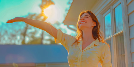 A woman in pastel pink pajamas breathes fresh air on the veranda of a modern white country house at dawn.