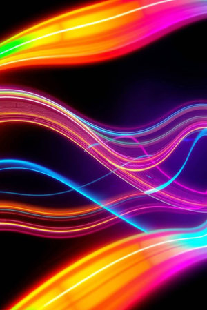 Dynamic, colorful light trails in wavy patterns against a dark gradient background.