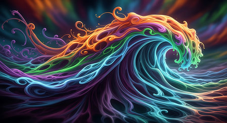 A psychedelic, abstract wave rendered in a dazzling spectrum of rainbow colors. Organic, flowing shapes create a sense of vibrant energy, movement, and unrestrained creativity, perfect for artistic concepts.