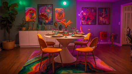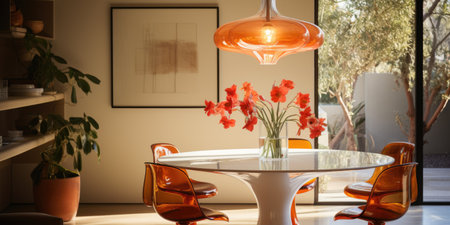 Retro Chic Breakfast Nook: Tulip Dining Table, Molded Plastic Chairs, and Vintage Pendant Light. Generative AI