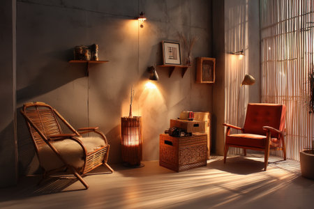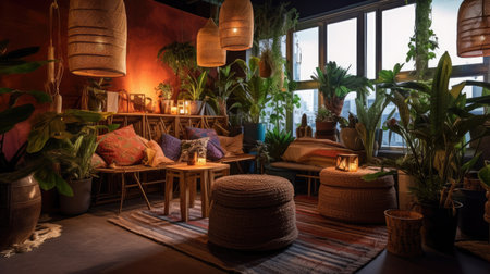 The interior of the room is in the boho style. A room lit by light from a window. AI generated.
