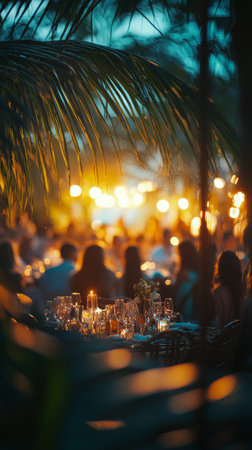 Guests enjoy a summer evening gathering in a tropical location. Soft lights create a warm atmosphere amid greenery, with tables set for a delightful dining experience.