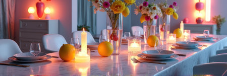 Elegant evening dinner table with flowers and candles in ambient lighting. That the image is generated using AI.