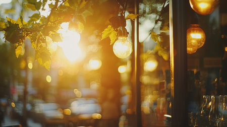 Warm golden light filters through leaves and illuminates hanging bulbs outside a cafe, reflecting city lights and creating a cozy, inviting atmosphere at dusk.