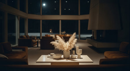 A cozy modern living room with large windows, featuring stylish furniture, warm lighting, and decorative elements like plants and books