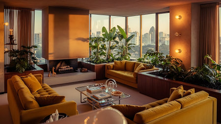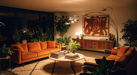 A cozy modern living room featuring orange sofas, a round coffee table, and lush indoor plants, illuminated by stylish lighting