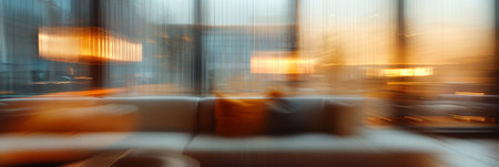 Blurred Hotel Lobby Abstract Background with Couches, Windows, and Warm Evening Light