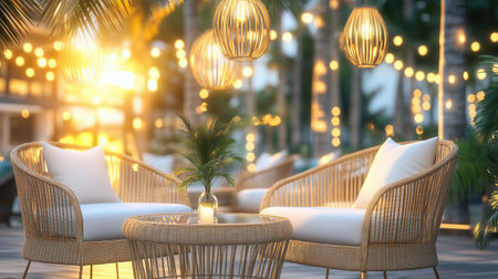 Tropical outdoor lounge with wicker furniture, glowing lanterns, and string lights at sunset. Relaxation, hospitality, and exotic getaway.